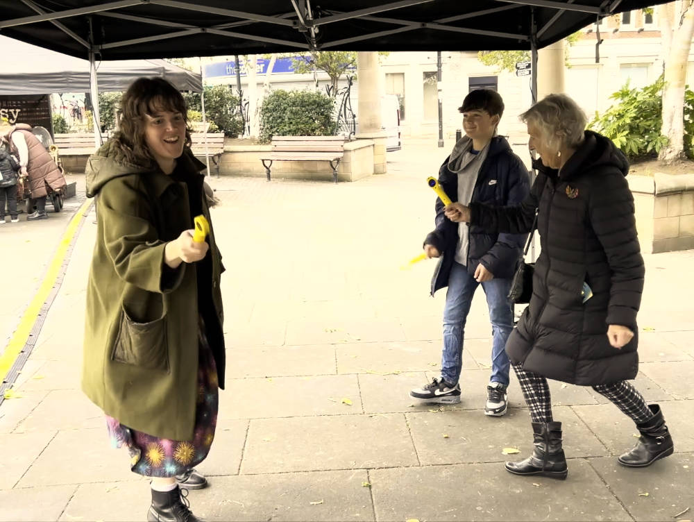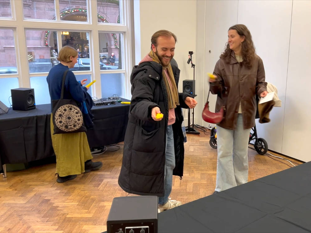 I created a well-being focussed, movement-activated, interactive installation that was run in the Displace Yourself Theatre studios in Bradford. This event was run as part of the Bradford 2025 Creativity and Wellbeing Week, and supported by the Bradford 2025 Creative Health Team. The participants were given Flowfal enabled wands which they used to trigger and move sounds around the space in 3D. This video shows the installation in action.